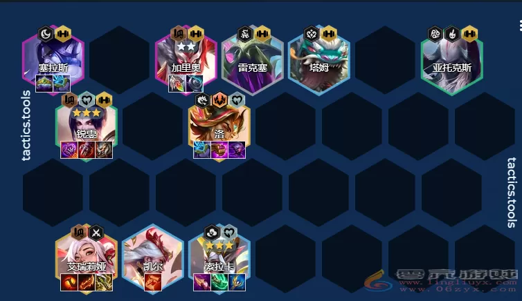 金铲铲之战S11夜幽九五阵容搭配推荐攻略1、阵容组成:诺手、约里克、拉露恩、奥恩、塞拉斯、刀妹、阿兹...